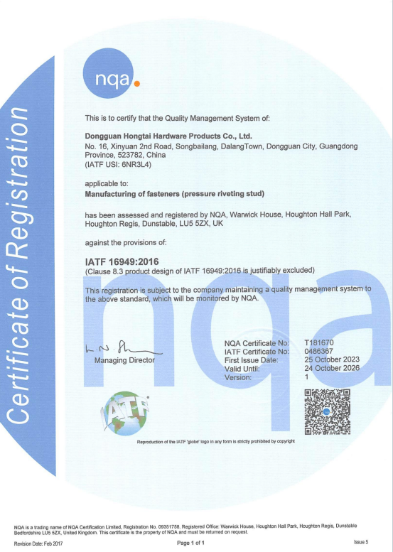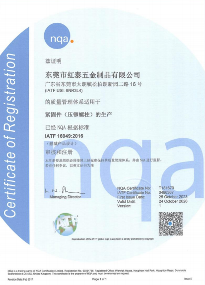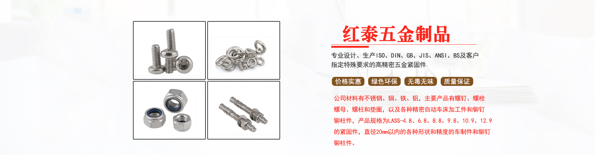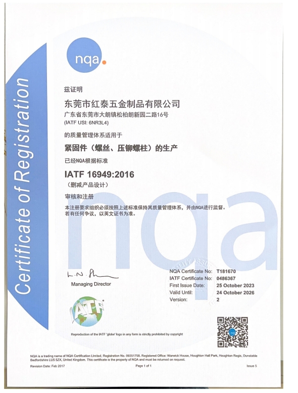 東莞市紅泰五金制品有限公司,公司占地六千多平方米,擁有五十多組螺絲機(jī)及六十臺自動車床設(shè)備。是一家專業(yè)設(shè)計、生產(chǎn)ISO、DIN、GB、JIS、ANSI、BS及客戶指定特殊要求的高精密五金緊固件的制造企業(yè)。